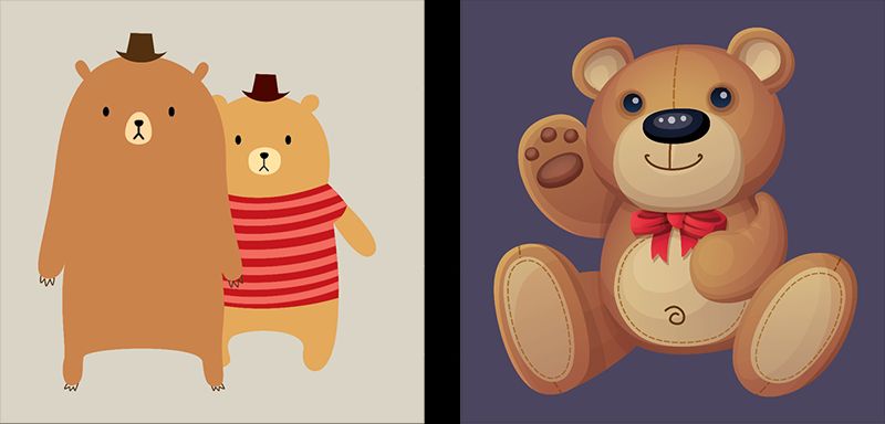 TRICK QUESTION. They are both vector. That crisp, cartoony look tells us this is a vector graphic. They are both a bit more complex than the vector bear from FIG 0.3, though. The file size probably wonât be trivially small, especially for the shaded teddy bear on the right. Letâs think about this for a second.