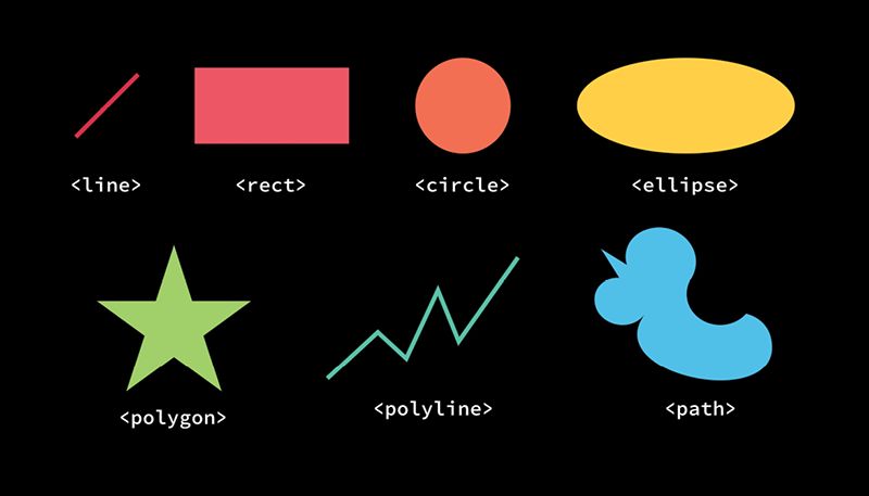 Thatâs it! All of these except path are considered âbasic shapes.â path is unique because it can draw anything, including any shape the other elements can draw. In fact, under the hood, all the other shapes are just a convenient syntax for a pathâsyntactic sugar, as they say. Drawing only gets slightly more complicated when you factor in fills, strokes, masks, and filters. But this is pretty much all SVG has to work with for drawing things. That doesnât mean itâs limited, though; these are fundamental elements of design in any two-dimensional medium.