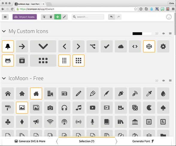 You arenât limited to the icons on the IcoMoon site; you can import your own. You can also create an account so that you can save your projects, making it easy to come back and add/remove/adjust icons and reexport them.