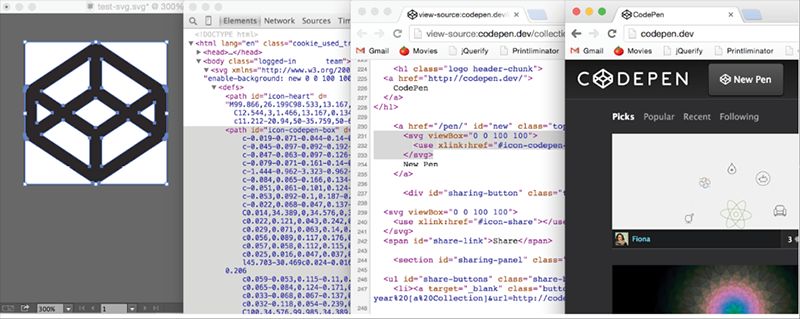 See the livereload: true option as part of the configuration for that watch task? Thatâs the icing on the cake here. If you have the LiveReload browser extension installed and turned on, your browser will refresh after the task is finished (http://bkaprt.com/psvg/04-04/). That means you can pop open an SVG in Illustrator, make edits, save it, and the browser will automatically refresh, immediately showing you the changes right on your site. Thatâs a dang delicious design workflow if Iâve ever seen one.