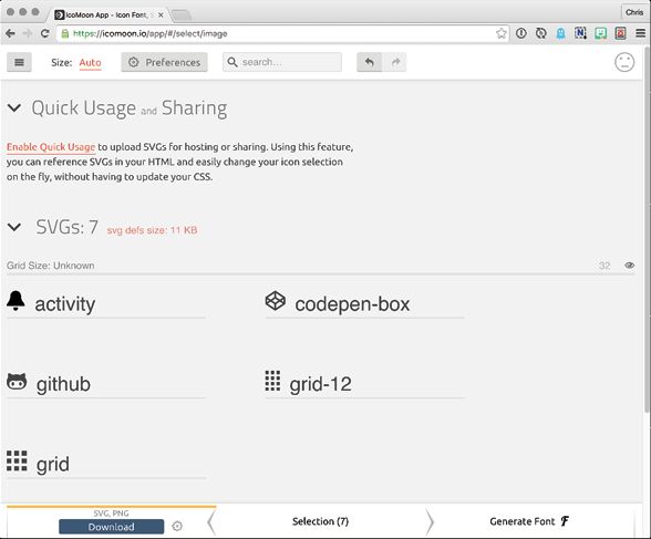 One of my favorite build tools for SVG is IcoMoon (http://bkaprt.com/psvg/04-01/). Its website has a very simple interface: a big grid of icons. First, select the icon you want, and then hit the Generate SVG & More button (FIG 4.2).